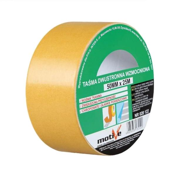 Лента на тканевой основе. Обладает высокой степенью прочности и адгезии. Устойчив к разрыву. Рекомендуется для грубых подложек. Производитель: Motive, Польша.