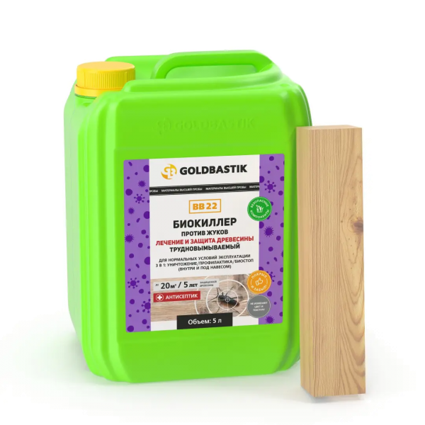 Трудновымываемый антисептик на водной основе для лечения древесины, пораженной дереворазрушающими насекомыми, а также для профилактической защиты деревянных конструкций от биопоражений и заражения насекомыми-древоточцами в условиях гигроскопического и конденсационного увлажнения, без контакта с почвенной влагой и атмосферными осадками. Обеспечивает уничтожение личинок и взрослых особей деревопоражающих насекомых, дальнейшую превентивную защиту от них, а также гниения, плесени, синевы внутри помещений и снаружи "под навесом".