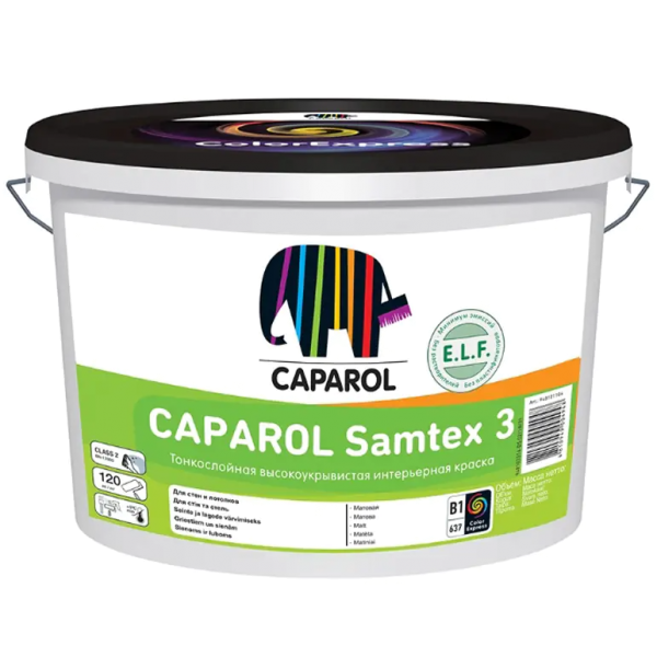 Caparol Samtex 3 E.L.F. Индекс 3 в нашем случае обозначает степень матовости - чем он выше, тем ближе к глянцевой становится краска. Данный вид создает глубоко-матовое покрытие. Также данная краска обладает индексом E.L.F, что обозначает отсутствие вредных примесей и выделений в данном материале. Степень устойчивости к истиранию в этом продукте хорошая, но далеко не лучшая в линейке. Поэтому эту краску чаще всего применяют для покраски потолков. Или в помещениях, где очень важна экологичность, так как по этому показателю это один из достойных вариантов. Средний расход: емкость 10л укрывает до 80 м.кв. поверхности в один слой. Производитель РБ.