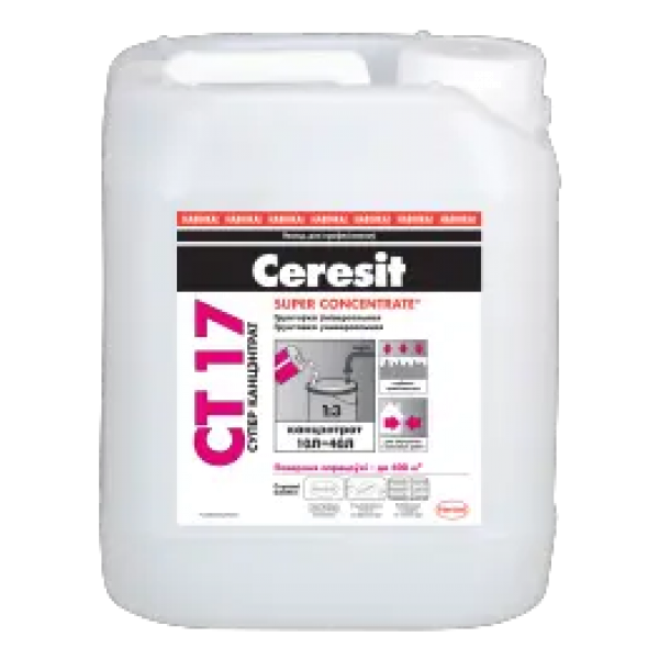 Грунтовка Ceresit CT 17 SuperGrunt применяется под отделочные работы внутри и снаружи зданий. Подходит для сильно впитывающих оснований: газосиликатные блоки, кирпич, минеральные штукатурки и шпатлевки, гипсокартон, дерево. Бесцветная, паропроницаемая. Объем канистры 10 л. Высыхает в течение 4 часов. Примерный расход 0,05-0,25 л/м2. Разводится водой в соотношении 1:1.