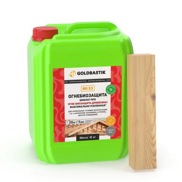 Комбинированное био-огнезащитное средство с максимально усиленным огнезащитным действием* для профессиональной защиты деревянных конструкций от возникновения и распространения пламени, а также гниения, плесени, синевы, насекомых- древоточцев в нормальных условиях эксплуатации (гигроскопическое и конденсационное увлажнение, без контакта с атмосферными осадками). Применяется внутри помещений, устойчиво к старению.