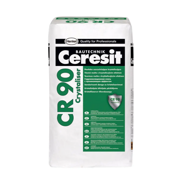 Смесь Ceresit CR 90 предназначена для устройства противоводной и противовлажностной гидроизоляции на недеформирующихся минеральных основаниях. Ceresit CR 90 работает двумя способами – в виде гидроизоляционного слоя на поверхности основания и дополнительно, в течение эксплуатации конструкции, создает кристаллы в порах основания. Водонерастворимые соли проникают в капиллярную структуру бетона, где за счет контакта с водой они постепенно создают кристаллы.