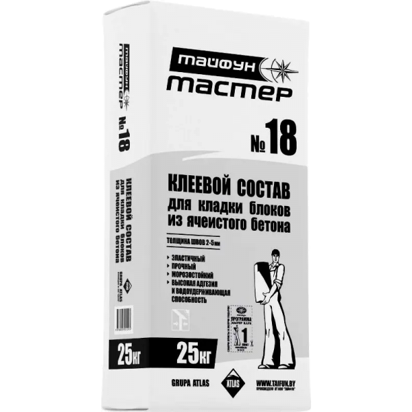 Клеевой состав «Тайфун Мастер» №18 (18М) применяется для кладки стен и перегородок из газосиликатных, пенобетонных, керамзитобетонных блоков и других штучных стеновых материалов. Также применяется для заполнения выбоин, сколов и трещин в кладке.