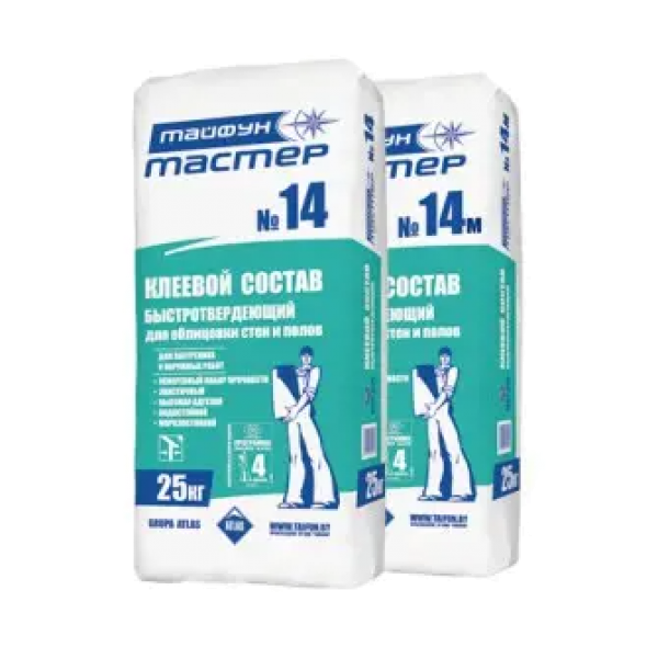 Быстродействующий клеевой состав для плитки и камней. Используется для облицовки стен, полов, перегородок и прочих поверхностей керамической плиткой, цементной плиткой, мозаикой, гранитом, натуральным и искусственным камнем. Применение данного состава незаменимо, если требуется немедленная эксплуатация готовой облицовки. Подходит для использования как внутри, так и снаружи зданий и сооружений. «Тайфун Мастер» №14 отличается ускоренным набором прочности, высокой адгезией и морозостойкостью.