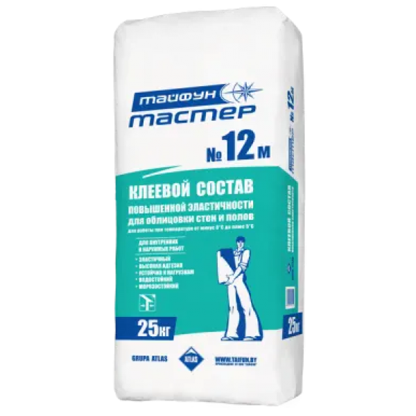 Клеевой состав для плитки и камней. Используется для облицовки стен, полов, перегородок и прочих поверхностей керамической плиткой, мозаикой, гранитом, натуральным и искусственным камнем. Применяется на основаниях, которые подвергаются динамическим нагрузкам и температурным перепадам. Подходит для использования как внутри, так и снаружи зданий и сооружений. «Тайфун Мастер» №12М отличается повышенной эластичностью и возможностью использования при минусовых температурах. В состав входит цементная смесь, полимерное связующее, наполнитель и добавки. Готовый состав должен быть использован в течение 30 минут с момента приготовления. Оптимальная рабочая температура основания и окружающей среды варьируется от -5ºС до +10ºС.