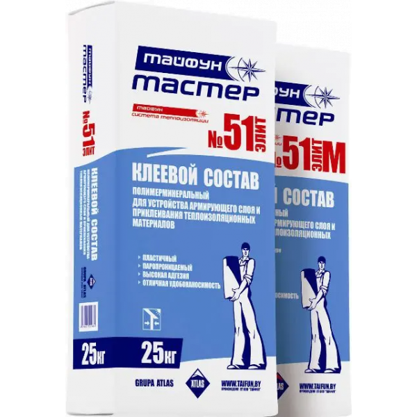 Клеевой состав «Тайфун Элит» №51 (№51М) применяется для устрой­ства армированного слоя в системе теплоизоляции фасадов зданий «Тайфун» . При необходимости применяется для наклеивания теплоизоляционных плит