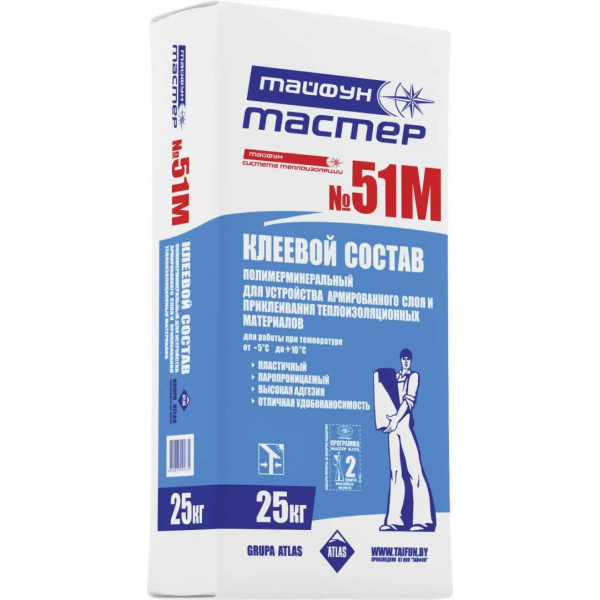 Клеевой состав «Тайфун Мастер» №51 (51М) применяется для устройства армированного слоя в системах теплоизоляции «Тайфун». При необходимости применяется для наклеивания теплоизоляционных плит.