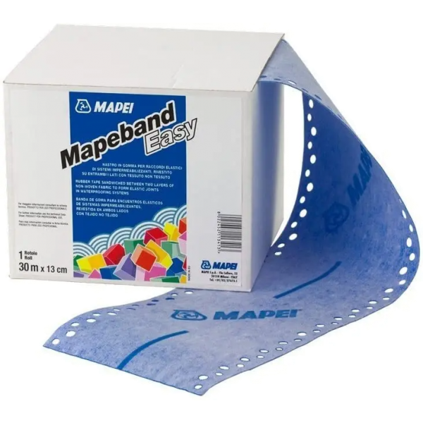 Mapeband Easy представляет собой эластичную паро- и водонепроницаемую резиновую ленту, помещенную между щелочестойким нетканым полипропиленовым полотном (в виде «сэндвича»).