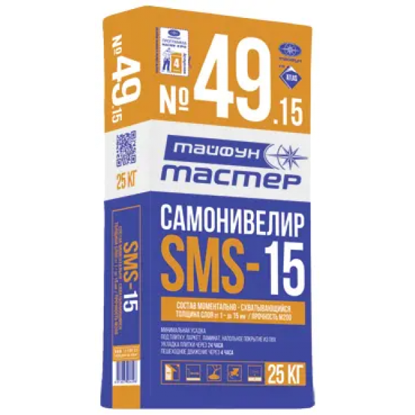 «Тайфун Мастер» №49-15 SMS – это самонивилирующаяся смесь для устройства пола. Применяется при стяжках, высококачественном выравнивании и корректировке различных горизонтальных поверхностей. Используется на минеральных основаниях. «Тайфун Мастер» №48 отличается повышенной прочностью, отличной растекаемостью, быстрым затвердением. Используется для внутренних работ в любых помещениях, может наноситься как машинным, так и ручным способом. В состав входит цементная смесь, полимерное связующее, наполнитель и добавки.