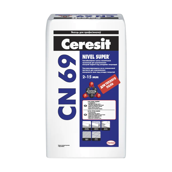 Самонивелирующаяся смесь Ceresit CN 69 предназначена для выравнивания бетонных оснований и стяжек пола из цементно-песчаных растворов, легкого бетона с последующей укладкой покрытий, таких как линолеум, ковролин, ламинат, паркет, керамическая плитка, плитка ПВХ и других полимерных покрытий в жилых, общественных, административных и бытовых помещениях, неподверженных постоянному воздействию влаги. Подходит для выравнивания обогреваемых стяжек, а также для подготовки основания под устройство обогреваемого пола.