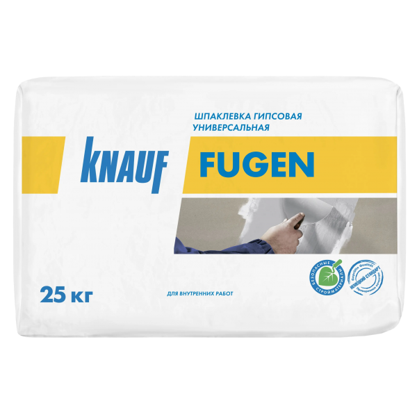 Шпаклевка гипсовая КНАУФ-Фуген разработана специально для заделки стыков гипсокартонных КНАУФ-листов (ГКЛ). Раствор при высыхании не трескается. Материал изготовлен из экологически чистого природного минерала (гипса) и не содержит вредных для здоровья человека веществ.