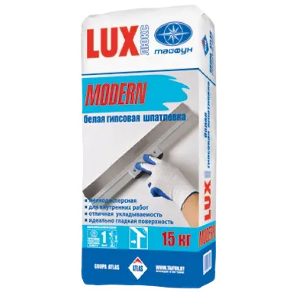 Оптимально подобранный состав гипсовой шпатлевки «Люкс» MODERN на основе гипса, полимерного связующего, наполнителя и специальных добавок позволяет: получить гладкую, ровную и прочную поверхность, устойчивую к мелению и высыпанию, образованию усадочных трещин; равномерно набирать прочность по всей толщине слоя – улучшает процесс обработки, исключает появление пятен при окраске; создать благоприятный микроклимат в помещении для здоровья и самочувствия людей; сократить сроки проведения отделочных работ – гипсовые смеси быстро приобретают необходимую прочность для осуществления последующего этапа работ.