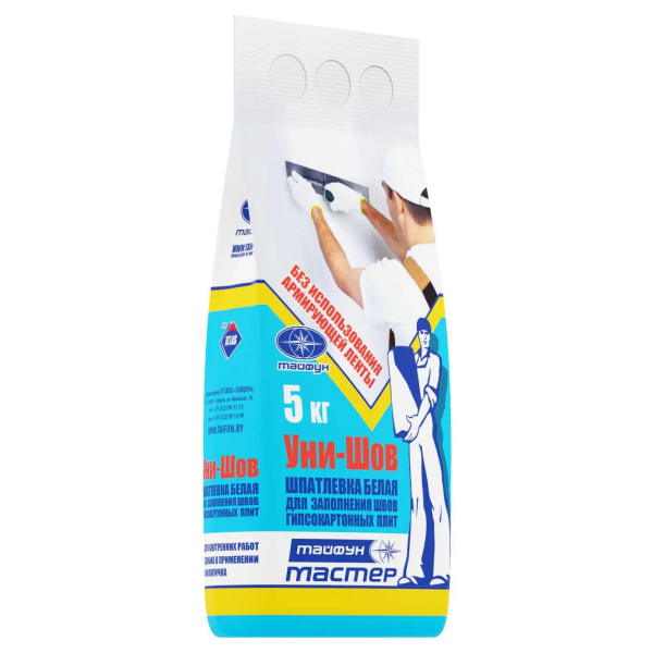 Шпатлевка белая «Тайфун Мастер» «Уни-Шов» предназначена для заполнения швов гипсокартонных плит внутри помещений без применения армирующих лент, для заделки стыков гипсокартонных листов с фабрично формированными краями и обрезанными, и торцевыми кромками со снятой фаской. Рекомендуется также применять для ремонта поверхностей стен и потолков