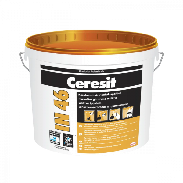 Готовая к применению полимерная шпатлевка Ceresit IN 46 предназначена для финишного выравнивания бетонных, кирпичных, штукатурных оснований, гипсокартонных плит, ГВЛ и т. д. под окраску и оклейку обоями внутри зданий. Благодаря применению технологии InSure и специальных заполнителей Smart Polymer шпатлевка позволяет получать эластичное и прочное покрытие. После отвердения легко шлифуется. Толщина слоя за одно нанесение – до 3 мм. Не применяется на деревянных, металлических, стеклянных и пластмассовых основаниях, а также в помещениях с высокой влажностью и для ремонта полов.