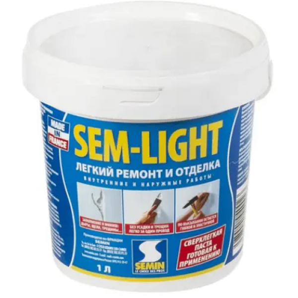 Semin sem-light (семин сем-лайт) - сверхлегкая, готовая к применению паста для ремонта и отделки снаружи и внутри помещений. Имеет вид белого снега. По высыхании похожа на пенопласт. Являясь безусадочным материалом, эта шпатлевка позволяет работать с высоким качеством и с несравненной легкостью. Эффективна для заделки трещин, выбоин, сколов и прочих дефектов основы. Не трескается, не скалывается, не требует шлифовки. При необходимости используется как выравнивающий состав. Высохнув, SEM-LIGHT становится гибкой и эластичной.