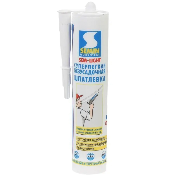 Шпаклевка Semin Sem Light практически не даёт усадки. Обеспечивает надежную заделку /заполнение трещин, сопряжений и стыков разнородных материалов, подходит для ремонта мелких дефектов и пр.