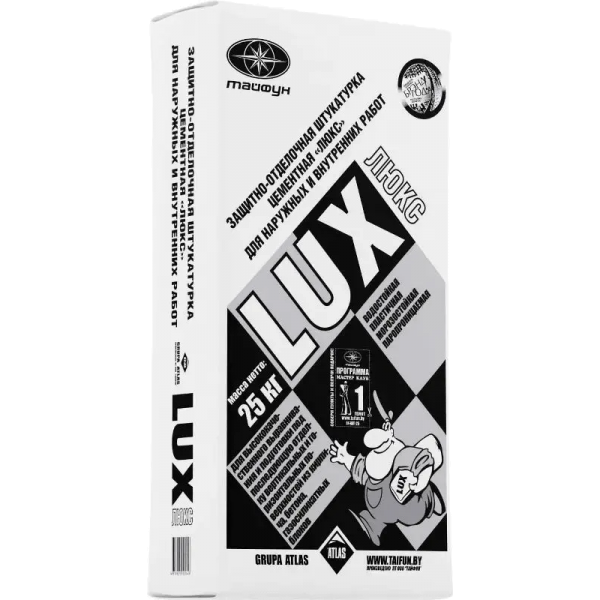 Штукатурка Люкс содержит цемент, кварцевый песок, минеральные вяжущие вещества и добавки. Является экологически чистым продуктом.