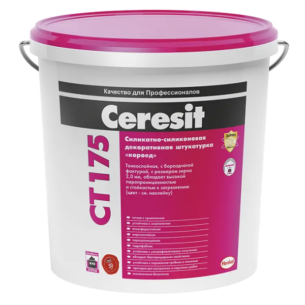 Силикатно-силиконовые штукатурки Ceresit CT 175 предназначены для выполнения декоративного тонкослойного покрытия на бетонных основаниях, штукатурках, гипсовых основаниях, гипсокартоне, ОСБ, ЦСП и т.п. для внутренней и внешней отделки. Применяются для создания декоративно-защитного слоя в легких штукатурных системах утепления наружных стен зданий при использовании в качестве утеплителя пенополистирольных и минераловатных плит.