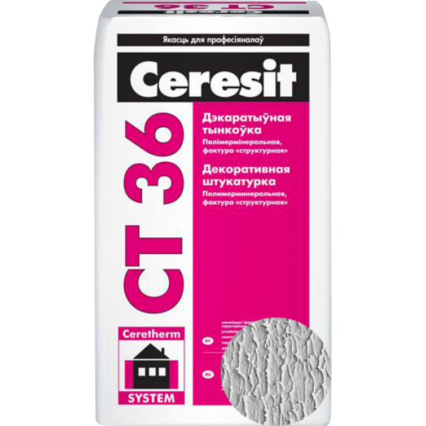 Штукатурка Ceresit CT 36 предназначена для выполнения декоративных тонкослойных штукатурок на бетонных, гипсовых основаниях, традиционных штукатурках внутри и снаружи, древесных плитах (ДСП, ОСБ, ЦСП и т.п.), гипсокартонных и гипсоволоконных листах внутри зданий. Применяется в качестве декоративного слоя в легких штукатурных системах утепления наружных стен зданий при использовании в качестве утеплителя как пенополистирольных, так и минераловатных плит.