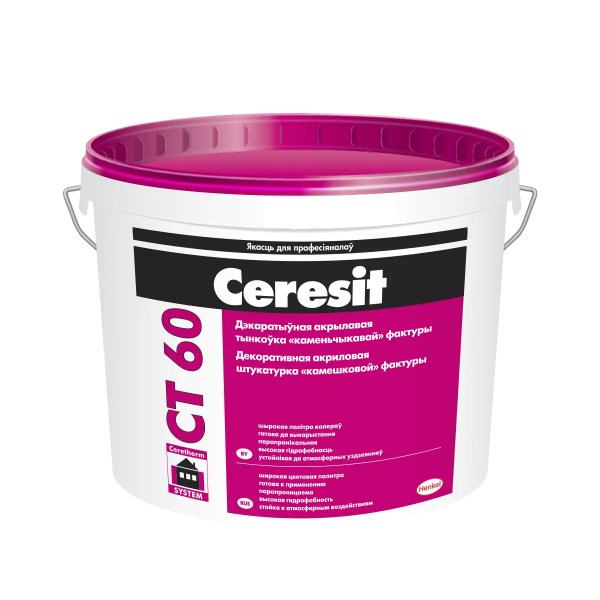 Акриловые декоративные штукатурки Ceresit CT 60, CT 63, CT 64 предназначены для выполнения декоративного тонкослойного покрытия на бетонных основаниях, штукатурках, гипсовых основаниях, гипсокартоне, ОСБ, ЦСП и т.п. для внутренней и внешней отделки. Применяются для создания декоративно-защитного слоя в легких штукатурных системах утепления наружных стен зданий при использовании в качестве утеплителя пенополистирольных плит. Не рекомендуется использовать акриловые штукатурки в системах утепления на основе минеральной ваты.