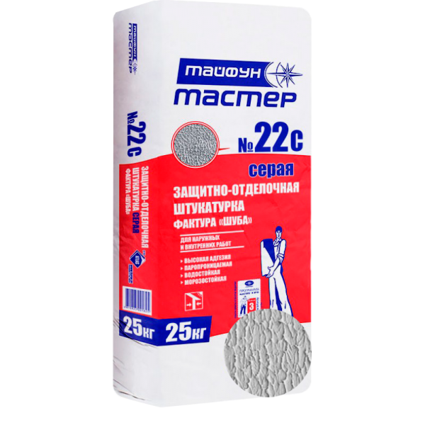 Защитно-отделочная штукатурка «Тайфун Мастер» №22с (серая), 22в (белая) применяется для устройства защитно-декоративного слоя с фактурой «шуба» в системах теплоизоляции «Тайфун», а также для устройства отделочных покрытий по минеральным основаниям внутри и снаружи помещений.