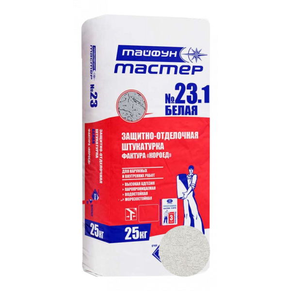 Защитно-отделочная штукатурка «Тайфун Мастер» №23 применяется для устройства защитно-декоративного слоя с фактурой «короед» в системах теплоизоляции и отделки «Тайфун», а также для устройства отделочных покрытий по любым минеральным основаниям внутри и снаружи помещений.