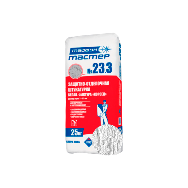 Защитно-отделочная штукатурка «Тайфун Мастер» №23 применяется для устройства защитно-декоративного слоя с фактурой «короед» в системах теплоизоляции и отделки «Тайфун», а также для устройства отде­лоч­ных покрытий по любым минеральным основаниям внутри и снаружи помещений.