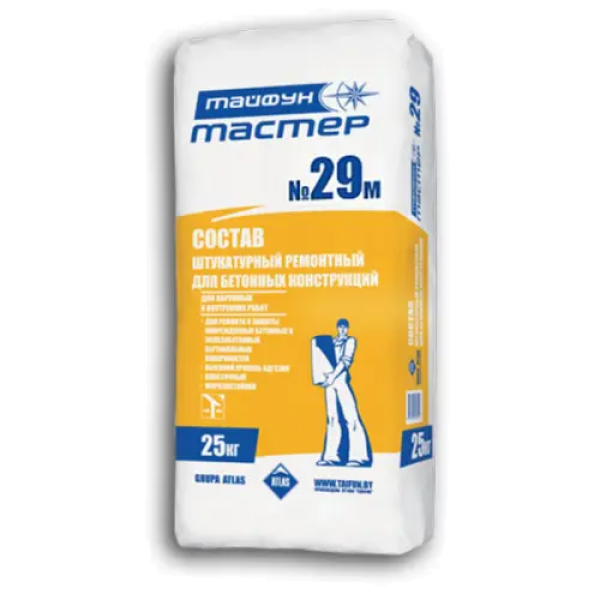 «Тайфун Мастер» №29М – это ремонтная смесь. Применяется при ремонте и защите поврежденных бетонных и железобетонных строительных конструкций.