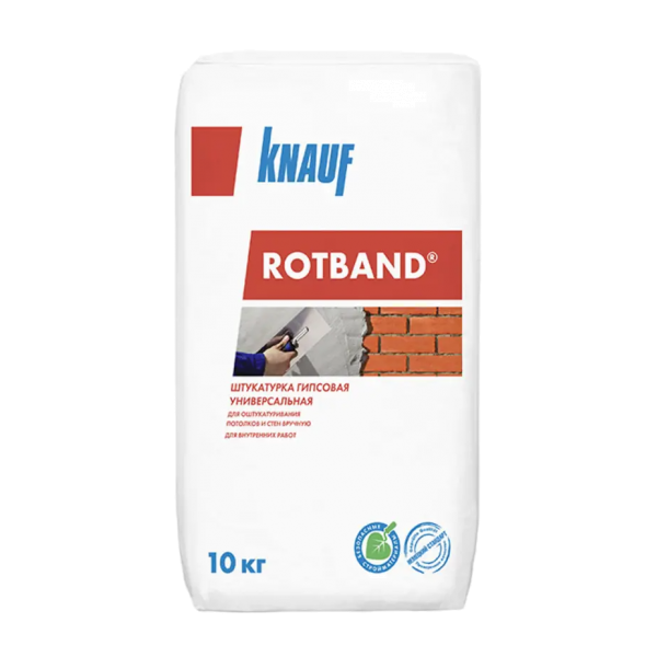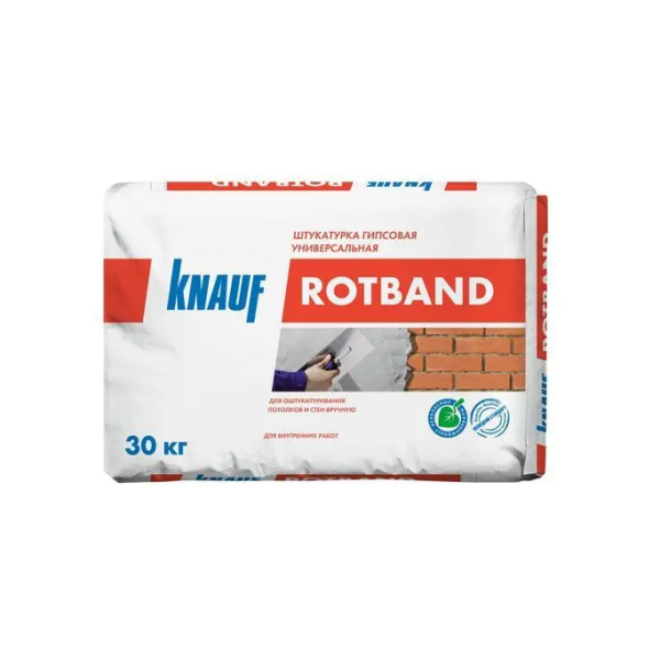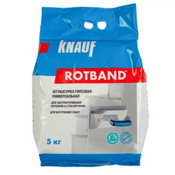 КНАУФ-Ротбанд – универсальная сухая штукатурная смесь гипсового вяжущего с легким заполнителем и полимерными добавками, обеспечивающими повышенную адгезию. Предназначена для высококачественного оштукатуривания вручную потолков и стен с обычным твердым основанием (бетон, кирпич, цементная штукатурка), а также поверхностей из пенополистирола, пазогребневых плит, ЦСП внутри помещений с нормальной влажностью, а также в кухнях и ванных комнатах (с покрытием, обеспечивающим защиту от увлажнения). Особенно рекомендуется для гладких бетонных потолочных и стеновых поверхностей.