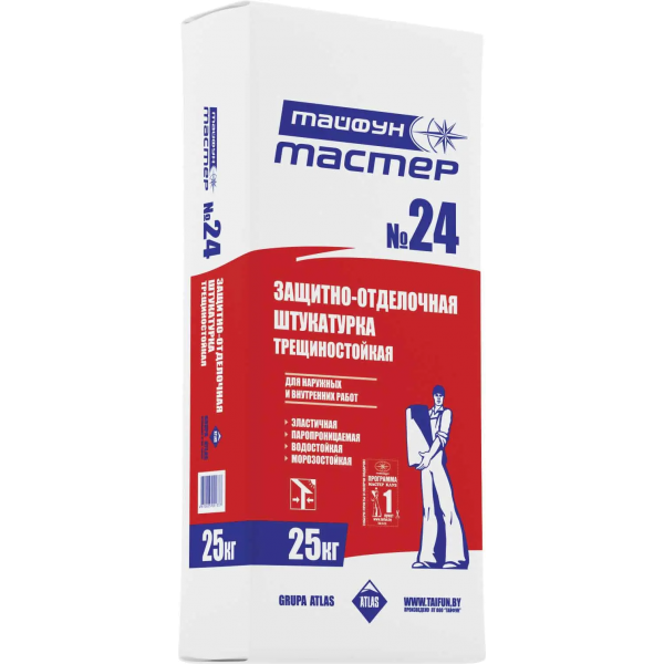 Тайфун Мастер № 24 — Штукатурка повышенной трещиностойкости для блоков из ячеистого бетона. Штукатурный состав «Тайфун Мастер» № 24 применяется для выравнивания и устройства отделочных покрытий по основаниям из газосиликатных или пенобетонных блоков внутри и снаружи помещений. Температура применения Тайфун мастер 24 — от +5 °С до +25 °С