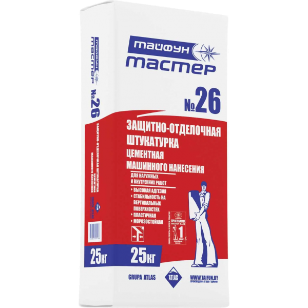 Тайфун Мастер № 26 — Штукатурка цементная машинного нанесения серого цвета, 25 кг. производство: РБ. Защитно-отделочная штукатурка «Тайфун Мастер» №26 применяется для выравнивания и подготовки под последующую отделку вертикальных и горизонтальных поверхностей из кирпича, бетона, газосиликатных блоков внутри и снаружи помещений