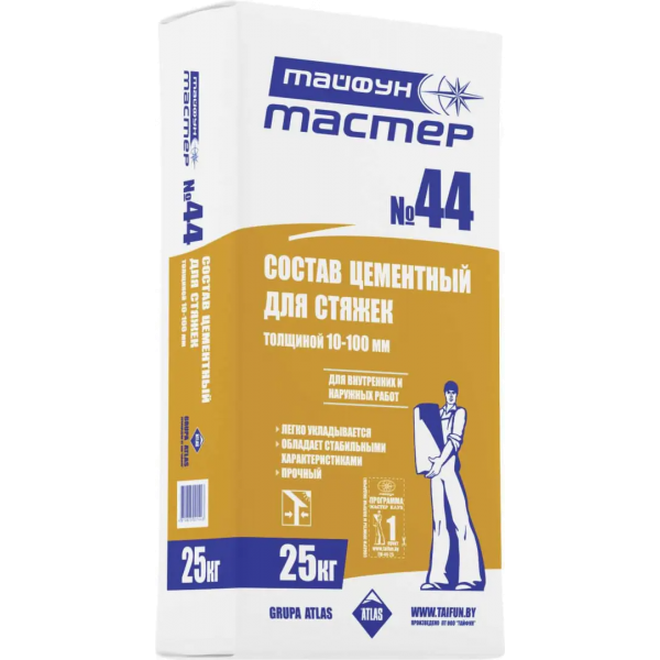 Состав цементный  для стяжек «Тайфун Мастер» №44 (44М) приме­няется для устройства горизонтальных бетонных полов толщиной одного слоя от 10 до 100 мм. Количество слоев может быть любое, при условии, что каждый последующий слой наносится не ранее 24 часов после нанесения предыдущего. Применяется для наружных и внутренних работ.
