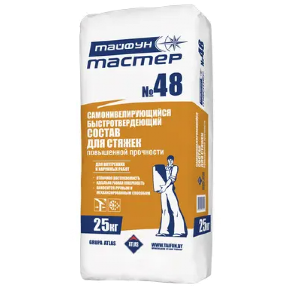 «Тайфун Мастер» №48 – это самонивилирующаяся смесь для устройства пола. Применяется при стяжках, при финишном выравнивании различных горизонтальных поверхностей. Используется на жестких и твердых основаниях из бетона, цемента и т.п. «Тайфун Мастер» №48 отличается повышенной прочностью, отличной растекаемостью, трещиностойкостью. Используется для внутренних и наружных работ, может наноситься как машинным, так и ручным способом. В состав входит цементная смесь, полимерное связующее, наполнитель и добавки. Готовый состав должен быть использован в течение 20 минут с момента приготовления.